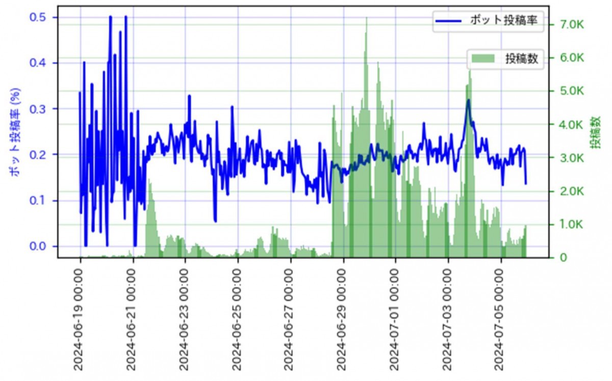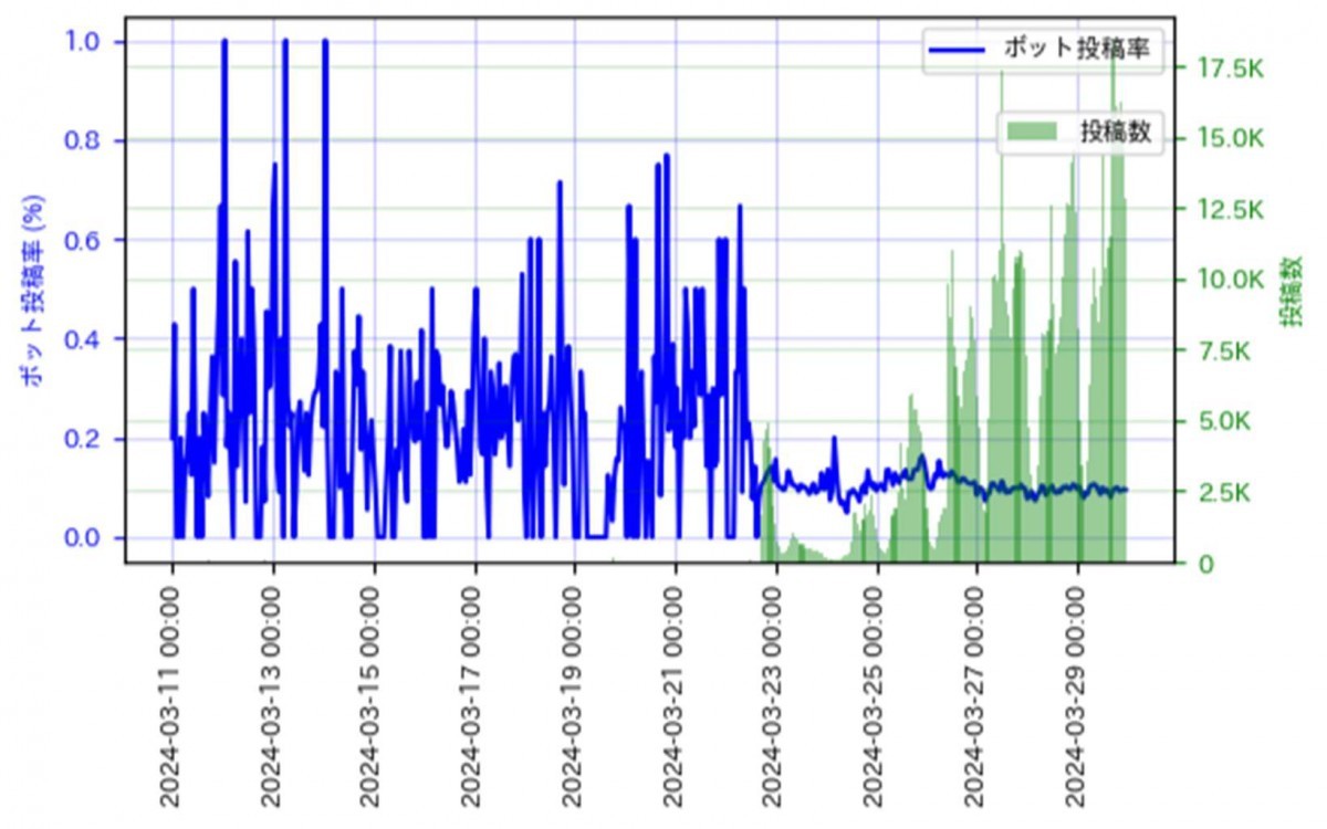 当該日次のボットポスト割合 = 当該日次のボットによるポスト数 / 当該日次の総ポスト数