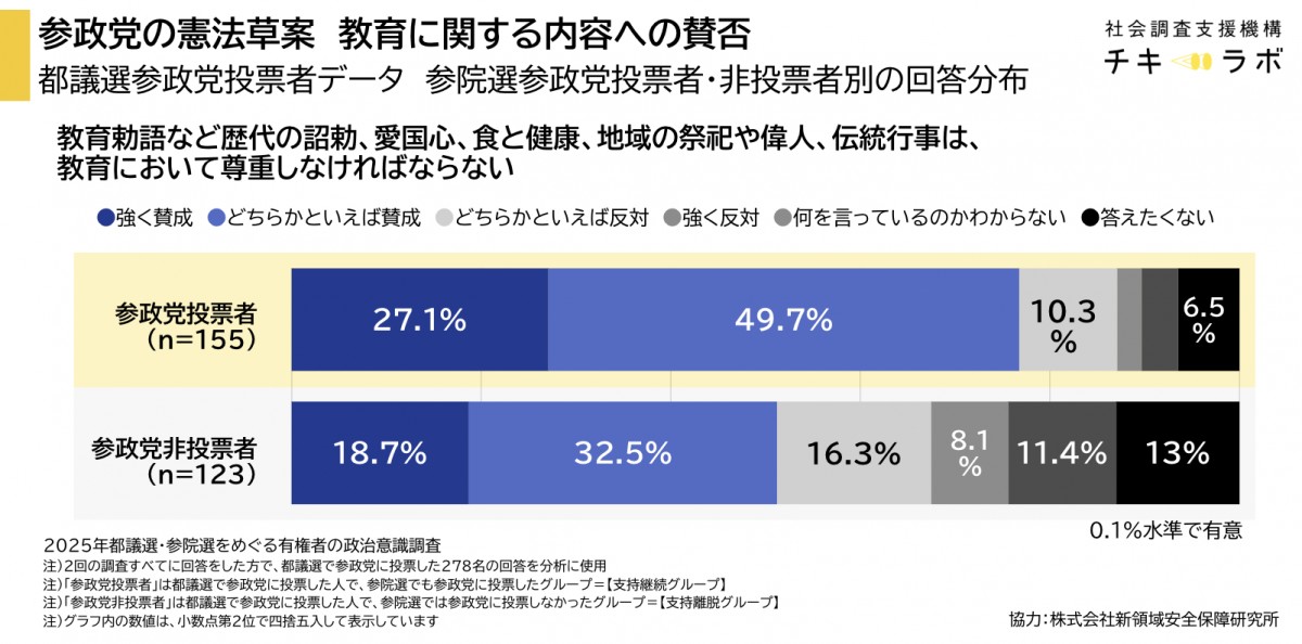 東京都の参政党支持者は東京都の有権者平均と比べると、教育政策を重視し、参政党の保守的な教育内容も支持する傾向に