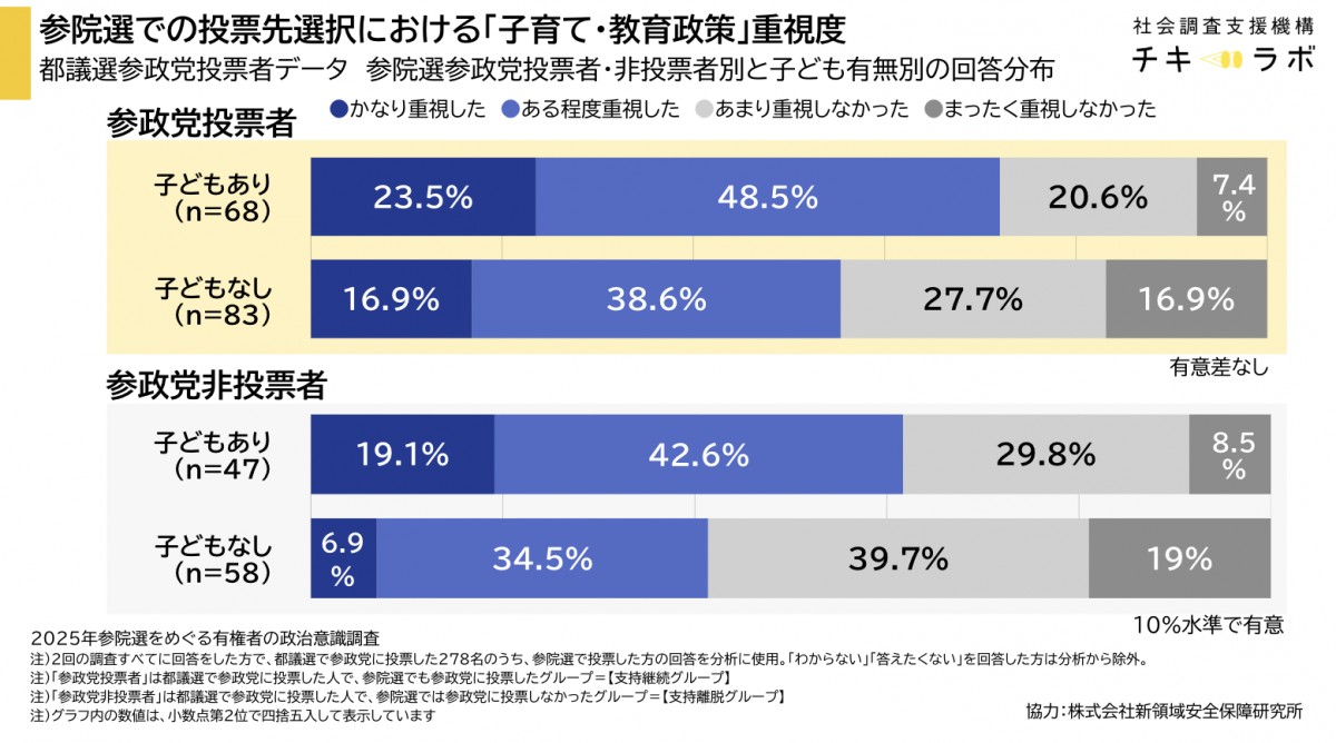 参政党支持者には、教育政策に関心が高い人が多いという傾向がはっきりと見られます。しかし、その中で「親」という立場にある人がとりわけ教育に対する政策要求が強いという関係は、今回の分析では確認されませんでした。