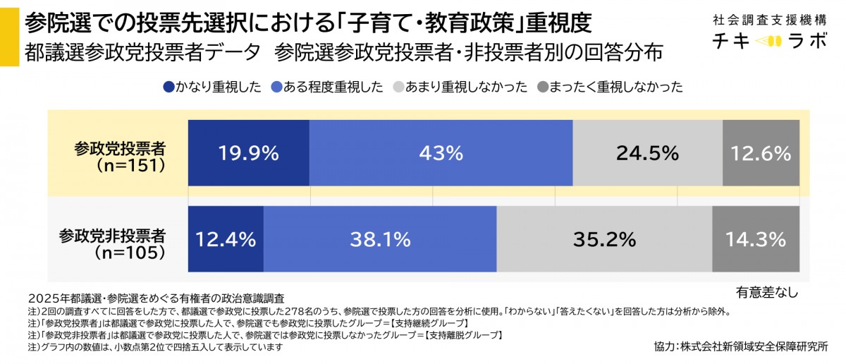 「Q あなたは参院選での投票先を決める際、次の政策テーマについて、どの程度重視しましたか。 選挙区、比例区での投票について、総合してお答えください。」との質問に対する「子育て・教育政策」の項目