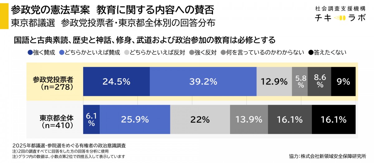 参政党支持者は東京都の有権者平均と比べると、教育政策を重視し、保守的な教育内容も支持する傾向にある。